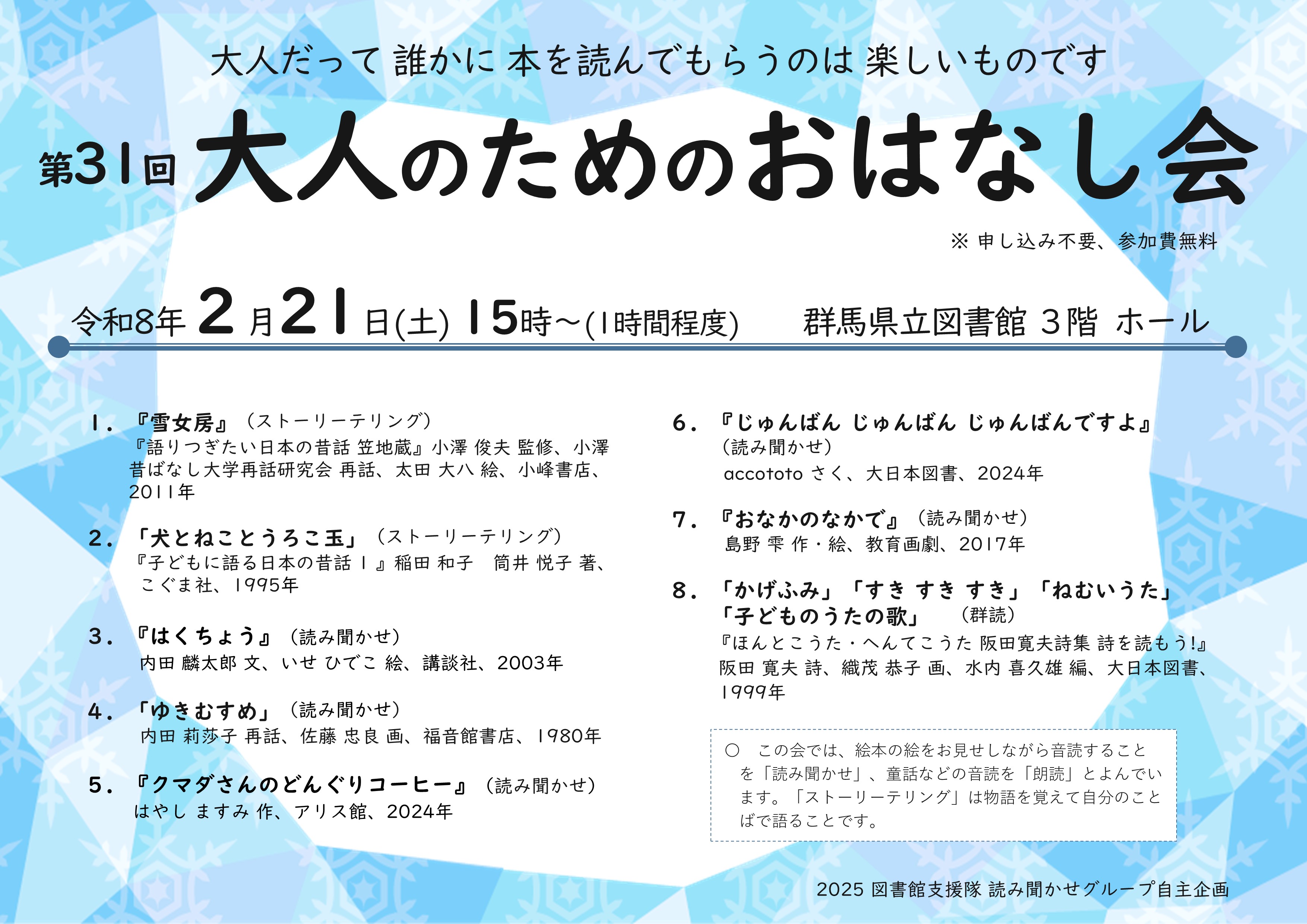 図書館支援隊読み聞かせグループによる第31回大人のためのおはなし会の開催が決定しました。